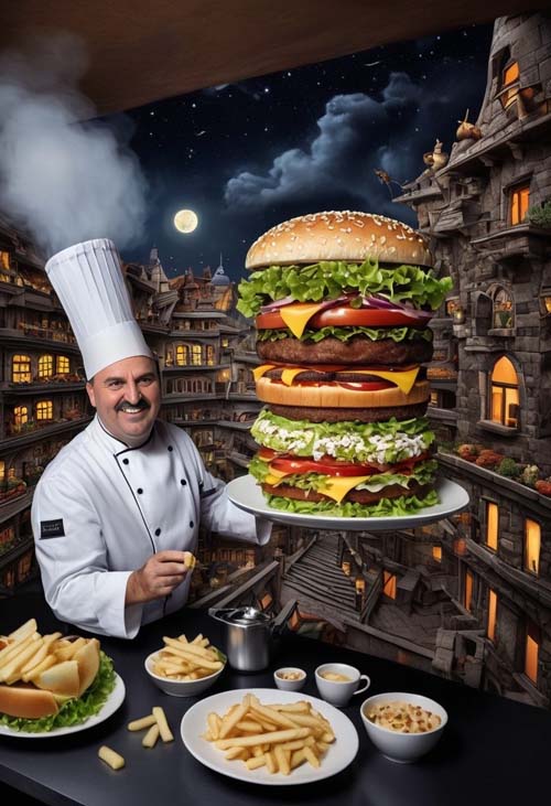 Klotzer hört unterdessen gar nicht mehr zu, weil er damit beschäftigt ist, einen Fischburger zusammen zu zaubern: “Eine Scheibe Doast, darauf eine Scheibe Lachs, zwei Scheiben Galbfleisch, darauf eine Bortion Remoulade, eine Schicht Salat, wieder eine Scheibe Lachs, Salat, zwei Scheiben Galbfleisch, Remoulade, und oben noch mal ne Scheibe Doast drauf