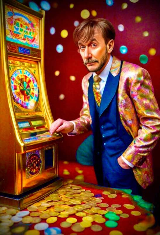 und scheinbar unbeteiligt die Spielautomaten im Blick behält. Seine Strategien und