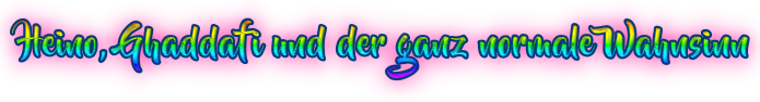 „Wenn i, assoh, Glück hab“, sagte der Verlagsinhaber, „dann werd i nur gefoltert und dann eingesperrt. Wenn i viel Glück hab, dann passiert mir gar nichts - dem Muammar is ja auch nix passiert“. Schalkhaft blinzelte von Braunau Ali an und begann dann zu kichern: „Hihihihihihihihihi“. Der Mann war offensichtlich irrsinnig! - Aber tatsächlich hatte er viel Glück: Ghaddafi gestattete ihm fürs erste, sich gemeinsam mit Ali und dem Schreber-Gerd zurückzuziehen. Allen dreien wurde jedoch zur Auflage gemacht, Röteln nicht zu verlassen. Der Schreber-Gerd, dem das Entsetzen über die Ereignisse der letzten Minuten die Zunge gelähmt hatte, begann zu jammern: