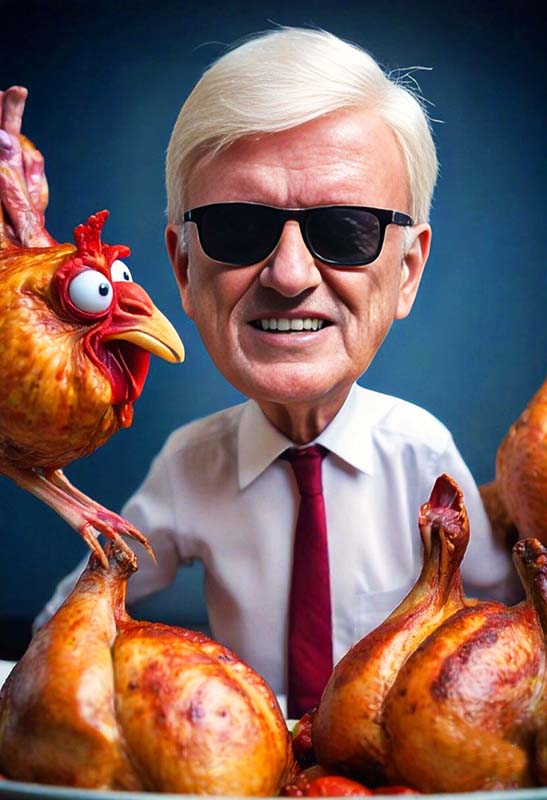 "Deshalb, assoh, is er hier", sagte von Braunau, ohne zu zögern, "das is' a Hormonstörung, eventuell psychisch bedingt. Das soll da Doktor Köters kontrollieren. Da Heino kriegt jetzt als erste Maßnahme jeden Tag Brathähnchen, weil da, assoh, viele weibliche Hormone drin sind, verstehens mi'? I hob' an Abo mit "Kuddels Ketchup-Katakomben" abgeschlossen, die bringen die Hendeln jeden Tag herüber. Ssodah!"