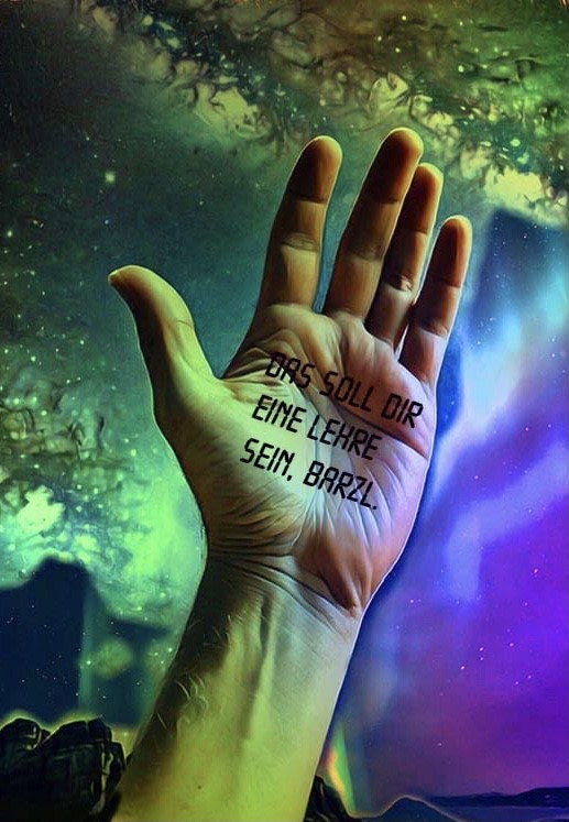 ... da langt plötzlich eine riesige Hand aus dem Himmel herunter... (genau! So eine wie die lustigen blau-weißen vom Münchner Oktoberfest, auf denen “Bier zu mir!” steht, nur noch viel größer)... und verpasst Herrn Spinoza eine gewaltige Ohrfeige. Bevor die Hand nach ihrem Streich wieder im Himmel verschwindet, winkt sie den Augenzeugen noch ein paar Mal zu, und jeder kann genau sehen, dass nicht “Bier zu mir!” in den Handflächen steht, sondern: “Das soll dir eine Lehre sein, Barzl!”