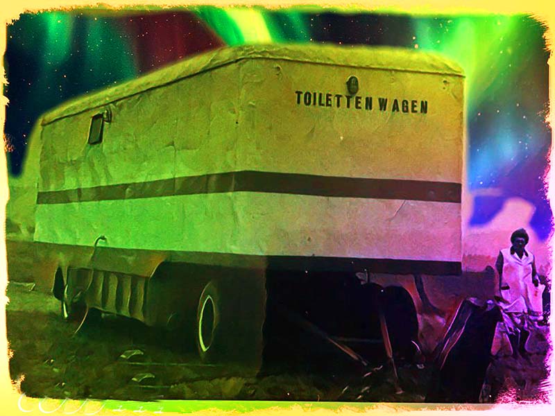 Warum um aller Welt hatte man direkt vor dem "Bürgerhaus" einen riesigen Toilettenwagen aufgebaut – so ganz solo, ohne Bier- oder Bratwurstbude in der Nähe etwa? Ali witterte Geheimnisvolles. Und er war entschlossen, der Sache auf den Grund zu gehen. Mit zwei Sätzen sprang er die Treppe hinauf, hatte die Türklinike bereits in der Hand – da wurde er von einer rüden Stimme zurückgepfiffen:
